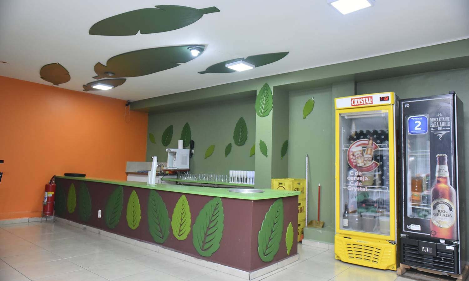 Uma área ao ar livre para bater um papo com os convidados e tomar uma cerveja geladinha. O espaço é bem fresco e agradável.
